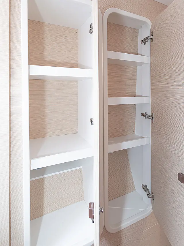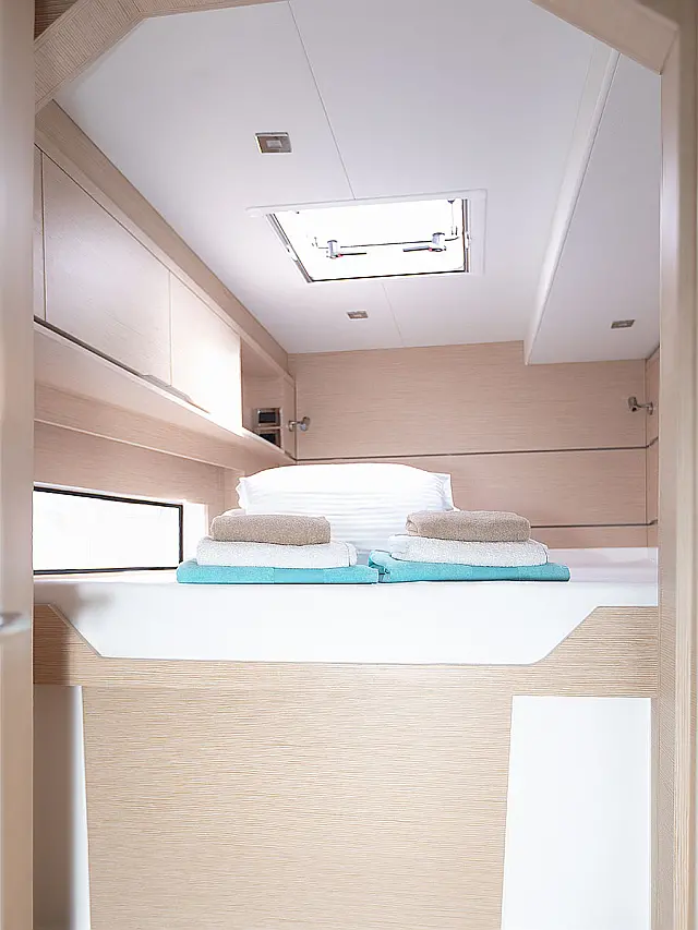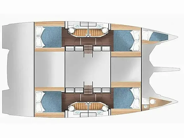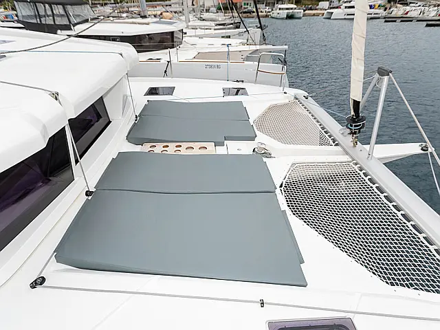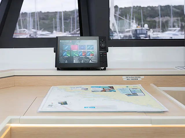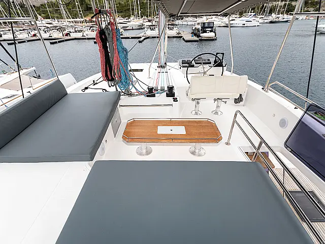 Teak cockpit, Single skippers cabin (portside), Skippers wc and shower (strarboard), Deck courtesy lights in cockpit, transom and flybridge, Teak cockpit table, Dinghy hoist system and electrical winch, Flybridge teak table, Pulpits with wooden seats, Aft deck, cockpit and stern natural teak, 12v 30L fridge in flybridge bench, Gas plancha grill in cockpit, Flybridge, cockpit and sundeck cushions - Faux leather, Windlass control chain counter, Wide flybridge bimini Sunbrella, Second swimming ladder, Fixed bowsprit with anchor roller cradle, Swimming ladders with wide steps, Teak deck, Flybridge Curtains in cabins, Interior courtesy LED lighting, Fans in saloon and cabins (7), Saloon curtains, Electric toilet (4) Drawer 160 Inox freezer, Drawer 320 Combi inox refrigerator, Nespresso coffee machine, Ice maker Services GEL batteries 165A (5), USB sockets in saloon and cabins, 220V Charger + 25m Shore power cable, 220V sockets in all cabins, Generator Fischer Panda (back position), Air conditioning 54K BTU, Solar Panels x 4. total power 992W (on bimini), Inverter 2000 W, Water maker, Air condition in saloon, Air condition in cabins Compass Riviera, Navigation Pack : auto-pilot, 2 instruments, transducer, wind, compass, GPS navigation : Raymarine AXIOM 12 MFD + keyboard MK10 - at helm station, Rear camera connected to Plotter, VHF - at helm station Fusion audio pack Dacron square top full batten mainsail, Lazy jack, Asymmetrical deck fitting (fittings for asymetrical gennaker and additional winch), Electric halyard winch (1), Electric windlass, Lazy bag